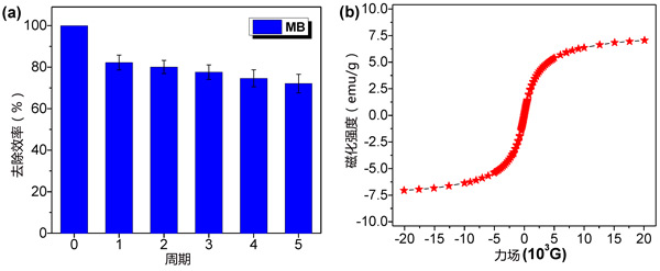 首先,研究了活性炭含量對磁性吸附劑吸附能力的影響。為了比較,活性炭的吸附容量也在相同條件下確定。在較高的初始染料濃度(5.0mM)下,磁性活性炭對MB和MO的飽和吸附能力明顯增加,隨著活性炭含量的增加。但是對于實際的吸附應(yīng)用,非常需要具有良好可重復(fù)使用性的吸附劑。我們通過使用乙醇作為洗脫劑來評估吸附MB的磁性活性炭的可重復(fù)使用性。如圖3a所示,解吸的磁性活性炭的去除效率隨著重復(fù)使用次數(shù)的增加而降低。與原來的去除效率相比,經(jīng)過5個解吸-吸附循環(huán)后,去除效率保持在72.1%左右。盡管如此,再生的活性炭的吸附能力仍然比較高,高于傳統(tǒng)的磁性吸附劑。此外,即使經(jīng)過5次再生吸附循環(huán)后,磁性活性炭仍表現(xiàn)出與新制備的相似的飽和磁化強(qiáng)度值(圖3b),表明這次的新型吸附劑具有良好的結(jié)構(gòu)穩(wěn)定性。