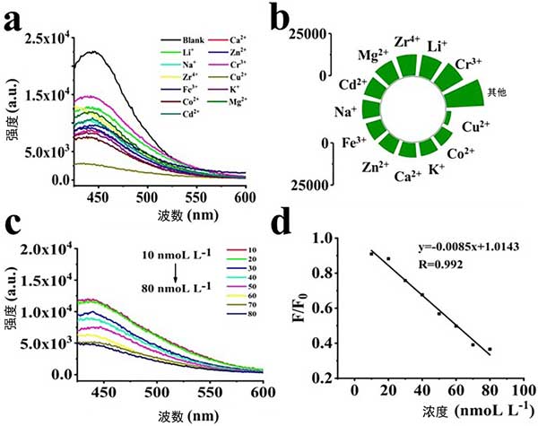 納米活性炭點對金屬離子的選擇性至關(guān)重要,添加納米活性炭點后檢查金屬離子的熒光強度。當(dāng)將納米活性炭點添加到空白溶液和含有12種金屬離子的溶液中時,發(fā)生熒光發(fā)射,如圖2a和b所示。然而,當(dāng)添加Cu2+時,納米活性炭點的熒光強度明顯下降,熒光強度下降了87.1%,表明發(fā)生了明顯的熒光猝滅。隨著Cu2+濃度從10nM增加到80nM,納米活性炭點的熒光強度隨著Cu2+濃度的增加而降低,如圖2c所示。線性相關(guān)系數(shù)(r)為0.992(圖2d)。檢測限(LOD)計算為3r/S,其中r代表空白信號標(biāo)準(zhǔn)偏差(n=11),n指對空白樣品進行重復(fù)測量的次數(shù),S(指斜率)的線性曲線)。因此,Cu2+的納米活性炭點的LOD計算為2.83nmol/L-1。一些報道的材料可以同時檢測兩種或多種金屬離子。例如,摻雜氮和硫制備的基于羊毛角蛋白的熒光CQD可以檢測Cr6+和Fe3+。相比之下,鴿糞合成的氮硫共摻雜熒光納米活性炭點可以檢測Hg2+和Fe3+。在我們的案例中,納米活性炭點對Cu2+的檢測表現(xiàn)出高選擇性。納米活性炭點的表面有機基團(-COOH和-NH2)具有很強的選擇性與Cu2+結(jié)合的能力,導(dǎo)致納米活性炭點聚集,產(chǎn)生較高的猝滅熒光強度,從而導(dǎo)致納米活性炭點的熒光強度猝滅。當(dāng)Cu2+濃度在10至80nM范圍內(nèi)時,熒光強度表現(xiàn)出良好的線性相關(guān)性,如圖2d所示。