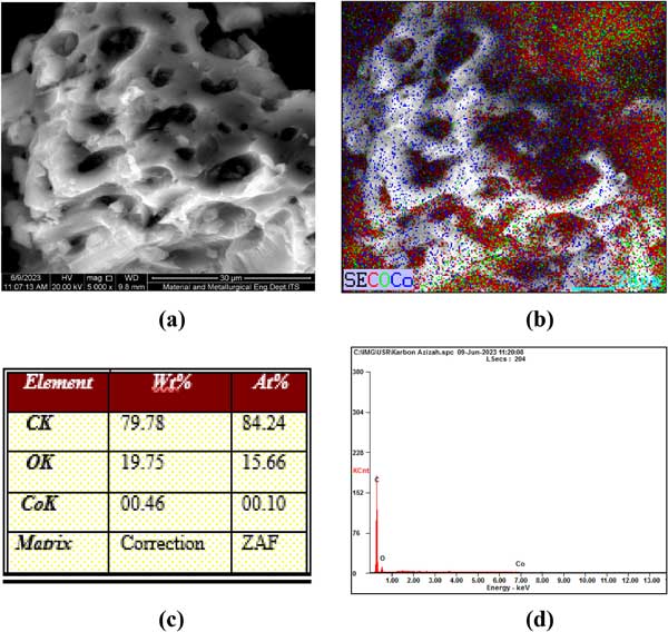 此外,EDX分析結(jié)果表明碳含量高(C=79.78%)和化學(xué)結(jié)合氧(O=19.75%),如圖1和2所示。5c和5d。還存在少量鈷(Co=0.46%),它是在碳化過程中出現(xiàn)的并且沒有得到最佳轉(zhuǎn)化,并且樣品洗滌過程也不是最佳的。下圖中,顯示了樣品的元素分布圖,其中碳為紅色,氧為綠色,鈷為藍(lán)色,分布均勻,如圖3b所示。這會(huì)影響吸附孔隙結(jié)構(gòu)的形成。