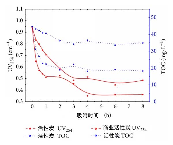 根據(jù)圖4,活性炭表現(xiàn)出良好的吸附生化水的性質(zhì)。UV254和TOC的濃度具有類似的變化趨勢。UV254和TOC的去除效率分別為63.0%和59.7%。商業(yè)活性炭的吸附性能較弱。UV254和TOC的去除率僅為52.9%和24.8%。商業(yè)活性炭的孔體積小于活性炭的孔體積。圖4中活性炭的UV254去除曲線分為兩個(gè)階段,它們分別對應(yīng)于膜擴(kuò)散和粒子擴(kuò)散。