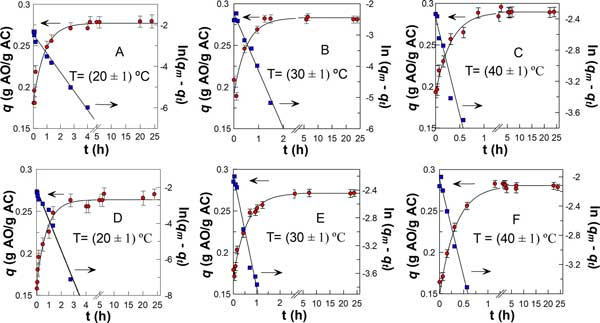 圖1顯示了典型的動(dòng)力學(xué)圖,說明了沒食子酸和沒食子酸丙酯在平衡(q)時(shí)每質(zhì)量活性炭吸附的抗氧化劑的量隨時(shí)間的變化。還顯示了在不同溫度下至少三個(gè)半衰期(相關(guān)系數(shù)>0.99)的相應(yīng)一階圖。在所有情況下,吸附曲線均顯示在4h后達(dá)到平衡,并至少維持24h,這是后續(xù)研究的時(shí)間。