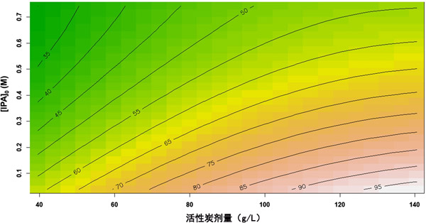 圖2:過氧化氫濃度和初始異丙醇濃度的相互作用效應(yīng)及其對總有機碳去除率的影響;钚蕴康膭┝勘3趾愣ㄔ90 g/L。