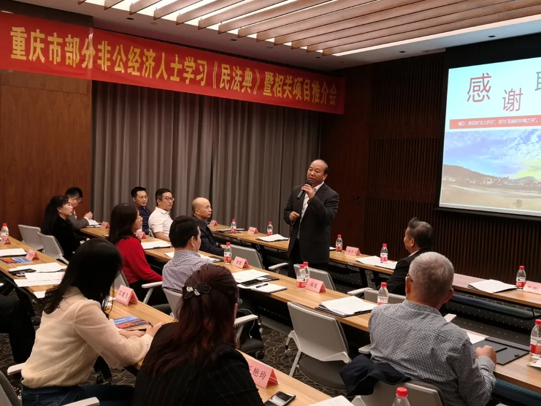 9月27日,峨邊縣項目推介會暨重慶市部分非公有制經(jīng)濟人士《民法典》學習講座在重慶市來福士廣場舉行。中共重慶市委統(tǒng)戰(zhàn)部原副部長、重慶市工商聯(lián)原黨組書記徐登全,中共峨邊縣委副書記、縣長栗那針爾,縣委常委、常務副縣長李威巍,二屆理事會執(zhí)行會長周華,陜西省重慶商會會長、集團董事長蘇玉木,集團黨委書記、副董事長曾祥蘭,重慶玉祥實業(yè)(集團)總經(jīng)理蘇新勝等60余位非公企業(yè)人士、嘉賓出席會議,重慶智安信公司董事長肖磊主持會議。