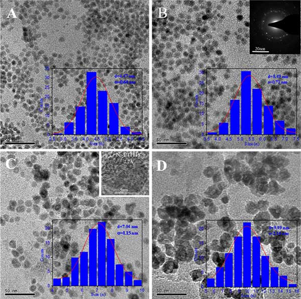 活性炭中鎳的透射電子顯微照片(圖1的A-d),納米粒子為球形且均勻地分布,這表明金屬磷化物納米顆粒的相對(duì)尺寸和分散度的化學(xué)反應(yīng)過程中合成。在催化劑合成過程中,油胺起還原劑的作用,從而控制成核速率。同時(shí),三辛基膦用作磷源和穩(wěn)定劑,通過Ni(0)表面的配位提供可調(diào)的表面穩(wěn)定性。在合成中,對(duì)于少量三辛基膦,發(fā)生Ni(II)前體的快速還原,導(dǎo)致Ni(0)物質(zhì)的重要濃度,其不能被溶液中存在的配體有效穩(wěn)定。然后,快速聚集過程的結(jié)果形成大尺寸的磷化鎳納米顆粒在活性炭載鎳催化劑。然而,當(dāng)油胺的量減少時(shí),制備少量核,并且大量三辛基膦的存在抑制它們的生長,導(dǎo)致形成小的納米顆粒。此外,所選擇的區(qū)域的電子衍射和晶格條紋的圖像(在所示圖1 B,C)表明,球形磷化鎳納米粒是單晶。因此,它的尺寸大于Ni 2通過改變油胺和三辛基膦的濃度可以很容易地調(diào)節(jié)活性炭催化劑,這提供了一種精確控制其尺寸在4到10nm范圍內(nèi)的方法,在這些方法中,這些磷化鎳納米顆粒在活性炭上以各種尺寸負(fù)載將具有不同的屬性可能導(dǎo)致不同的反應(yīng)性。