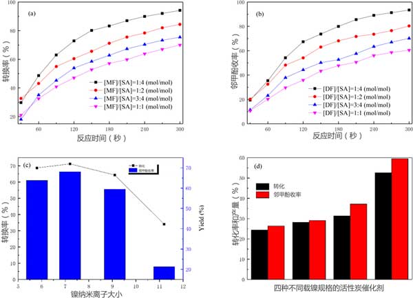 為了研究磷化鎳尺寸對(duì)活性炭催化性能的影響,SA的加氫脫氧在220℃和2MPa氫氣壓力下進(jìn)行。在催化活性的顯著差異可以為鎳中觀察到活性炭變化的尺寸。隨著磷化鎳納米顆粒的減少,轉(zhuǎn)化率先增加然后減少。其中,活性炭在加氫脫氧反應(yīng)中表現(xiàn)出更高的反應(yīng)性,在180分鐘內(nèi)SA的轉(zhuǎn)化率達(dá)到99%以上,對(duì)鄰甲酚的收率超過97%。較小的鎳微晶表現(xiàn)出更強(qiáng)的Ni-P相互作用和磷在表面上的額外暴露,這顯著影響中間體的吸附狀態(tài),其中磷化鎳與反應(yīng)物之間的相互作用既不太弱也不太強(qiáng)。因此,可以通過使用不同納米顆粒尺寸的磷化鎳來控制SA的加氫脫氧活性。