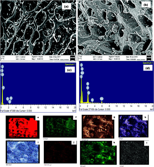 同時(shí),EDX結(jié)果也證實(shí)了用KMnO 4和氯氧化鋯的氧化過程顯著增加了載鋯活性炭上的氧部分。元素組成結(jié)果要求Zr金屬元素在碳表面上的含浸量為14%。其他氧化元素的存在,即氧氣和錳也證實(shí)了載鋯活性炭?jī)?nèi)在的氧化活性。在改性過程中,與未加工的活性炭相比,氧部分變成了兩倍以上,而活性炭對(duì)于應(yīng)用部分則顯示出良好的征兆。因此,F(xiàn)E-SEM和EDX映射的結(jié)果聯(lián)合顯示,這種改性將原始活性炭的結(jié)構(gòu)模式改變?yōu)榫哂懈嗫椎母植诘暮醣砻,這將有助于其應(yīng)用。