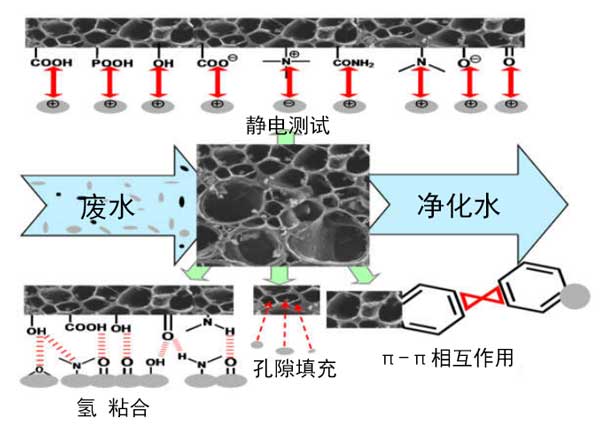 應(yīng)該注意的是,對(duì)活化過程的理解是優(yōu)化活性炭制備的基本步驟。實(shí)際上,各種化學(xué),物理和物理化學(xué)方法被用于從不同的天然或合成資源合成活性炭;瘜W(xué)處理涉及通過浸漬然后熱解使用活化劑,而物理過程涉及在蒸氣或二氧化碳存在下的高溫?zé)崽幚怼5,這兩種方法的組合也已用于生產(chǎn)活性炭。根據(jù)所采用的處理方法,很難預(yù)測(cè)碳的物理化學(xué)和形態(tài)特性。看來形態(tài),物理化學(xué),質(zhì)地,通過改變活化時(shí)間和溫度以及所用前體的性質(zhì),活性炭的表面性質(zhì)會(huì)發(fā)生顯著變化;钚蕴勘砻娴幕瘜W(xué)性質(zhì)取決于存在于表面上的雜原子的類型,例如氧,氮,硫等。這些積累在表面上的雜原子或基團(tuán)要么來自原材料本身,要么在活化過程中被引入。這在很大程度上與前體的性質(zhì)有關(guān)。所有這些特性對(duì)于使用碳作為水溶液中污染物的吸附劑具有重要意義。實(shí)際上,污染物在活性炭上的吸附是一個(gè)復(fù)雜的過程,在涉及物理作用和/或化學(xué)鍵的過程中,各種相互作用可以共存。從而,可能發(fā)生的吸附機(jī)理為靜電相互作用,氫鍵,π-π堆積相互作用,孔填充,疏水相互作用,離子交換以及其他相互作用(n-π相互作用等)和絡(luò)合反應(yīng)。圖2說明了在活性炭上吸附污染物的主要相互作用方法。