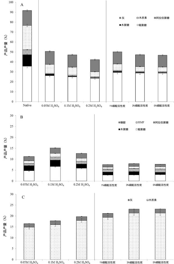 圖2:磷酸加入活性炭的濃度對生物質(zhì)分離的影響(A)固體部分,(B)含水部分,(C)有機(jī)部分。