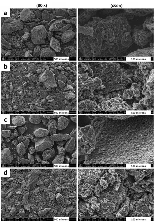 我們使用現(xiàn)代分析技術來了解制備的活性炭催化劑的真實性質,掃描電子顯微鏡(SEM)是查看材料形態(tài)的強大工具。圖1顯示了四種活性炭樣品的SEM圖像。圖像是在兩個不同的分辨率,以比較不同比例的樣本。評估不同煅燒溫度的影響是很重要的。圖1的左側圖像顯示,無論煅燒溫度如何,所有樣品的表面都被各種亞微米大小的顆粒所掩蓋,并且表面上存在許多明顯的解理。不同煅燒溫度下的熱解對活性炭樣品的形貌影響不大,但有輕微的變化,如一些顆粒從表面被去除,一些解理被侵蝕。此外,從這些SEM圖像可以推斷,這些活性炭材料中的許多微孔結構使其成為任何化學反應中反應物相互作用的極好載體。