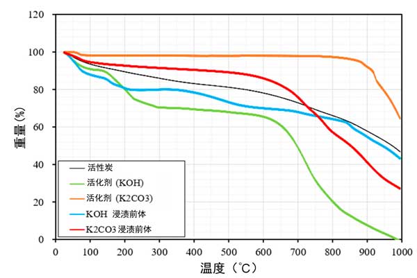 圖1:用每種化學品浸漬的化學試劑和碳前體的熱重分析結(jié)果。
