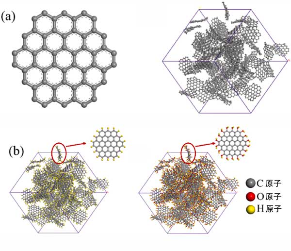 圖1:(a)顯示了基本活性炭的結構和微孔活性炭模型,(b)具有不同官能團的微孔活性炭(a)–H;(b)–OH。