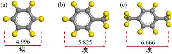 圖2:不同芳烴分子的模型(a)苯;(b)甲苯;(c)對二甲苯。