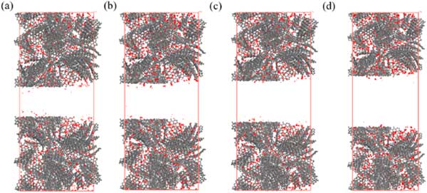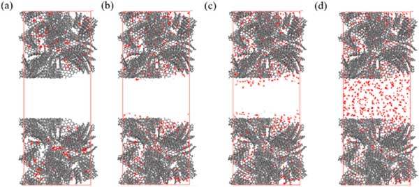 活性炭由微孔和介孔組成,介孔在一定程度上影響吸附特性。因此,研究芳烴在具有分級孔的活性炭上的吸附特性,以明確介孔對下一節(jié)吸附特性的影響。在這些模擬中,選擇了密度為0.8g/cm3的微孔活性炭,不同樣品的中孔尺寸分別選擇為2.0、2.5、3.0和4.0nm。具有不同層次孔隙的活性炭。分層孔隙活性炭模型構建為密度在0.6-0.7g/cm3的合理范圍內(nèi)。圖3展示了苯分子在p=10kPa下具有不同中尺度孔徑的活性炭上的吸附位點分布。這表明即使在p=10kPa時,苯的吸附也僅發(fā)生在介孔表面,而不會填充介孔的空隙空間。圖4說明了對二甲苯在具有3.0nm孔的活性炭上從低壓到高壓的吸附位點的變化。從圖4(a)-(d)可以看出,只有微量的對二甲苯分子被吸附到微孔上,當壓力為1.25kPa時,微孔逐漸被填滿,中孔壁上出現(xiàn)吸附位點。當壓力增加到3.75kPa時,吸附位點增加,介孔中開始出現(xiàn)多層吸附,最終介孔充滿對二甲苯,此時壓力可達6.25kPa。