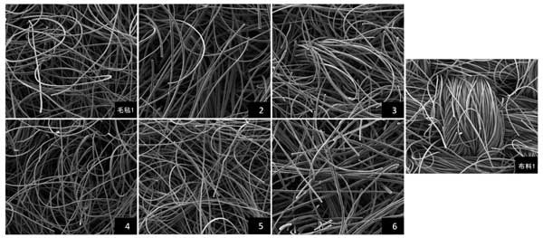 活性炭材料的結(jié)構(gòu)特性,包括編織類型、厚度、密度、BET表面積和微孔率。非織造纖維型比織造活性炭型厚2至4.5倍,但密度不如活性炭,使毛氈型具有海綿狀外貌。活性炭纖維材料的BET表面積都很大,微孔面積也比較大。平均微孔面積百分比范圍為83.9%至93.2%,平均孔徑范圍為1.59至1.70nm(<2nm),表明活性炭材料主要是微孔的。BET表面積與微孔面積(r=0.997)呈強正相關(guān),但與微孔面積百分比(r=-0.982)呈強負(fù)相關(guān)。活性炭材料中纖維的組織顯示在SEM圖像中200倍放大倍數(shù)下,毛氈型顯示隨機排列的松散無紡纖維,而布料型顯示緊密編織的纖維,外觀更致密(圖1)。