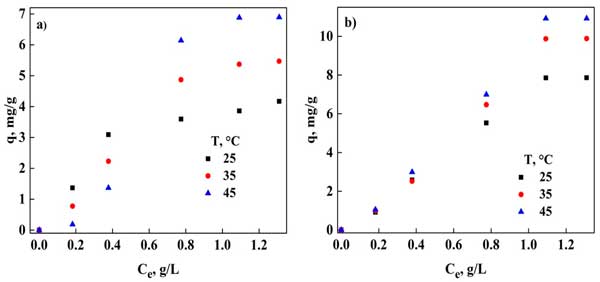 平衡吸附分析使我們能夠獲得不同等溫線模型的參數(shù),表明在去除污染物時進行了何種類型的過程。在圖1中,顯示了使用粉末活性炭(圖1a)和活性炭(圖1b)在不同溫度下DNS的吸附能力。還觀察到3,5-二硝基水楊酸在兩種吸附劑中的吸附都隨著溫度的升高而顯著影響,隨著溫度的升高呈現(xiàn)出更大的吸附。因此,在45℃時,活性炭和粉末活性炭的大吸附容量分別為6.97和11.57mg/g。這可能是由于去除過程的環(huán)境,這會導致吸附劑表面隨著溫度的升高而增加其對3,5-二硝基水楊酸吸附的參與。使用商用活性炭的文獻中也報道了類似的行為。在其他研究中,使用這種吸附劑還觀察到,基于苯酚、高氯酸鹽和重金屬等的不同化合物的吸附能力有所增加。