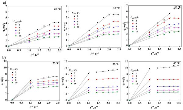 外部和粒子內(nèi)傳質(zhì)過程的分析可以對3,5-二硝基水楊酸的吸附產(chǎn)生顯著影響,在去除3,5-二硝基水楊酸時可能存在由于物質(zhì)傳輸造成的限制,這有必要對這種現(xiàn)象進行分析。圖2a是以外擴散模型為基礎構(gòu)建的,從中可以看出,對于活性炭,在吸附過程中接觸長達6小時的實驗點處存在一條直線,這表明存在以下可能性,在任何溫度的過程中通過外部傳質(zhì)控制。圖2b顯示了粉末活性炭在3,5-二硝基水楊酸吸附中獲得的實驗數(shù)據(jù)的表示,其中在與吸附劑接觸1小時時觀察到一條直線。這表明使用活性炭粒子不存在外部傳質(zhì)問題,因為3,5-二硝基水楊酸會迅速從溶液中去除,擴散到表面。此外,這表明活性炭顆粒中的吸附過程可能是由于表面存在的官能團。根據(jù)這些結(jié)果,確定是否也存在內(nèi)部傳質(zhì)問題很重要,從而能夠確定3,5-二硝基水楊酸刪除過程是否受到這種現(xiàn)象的存在的顯著影響。