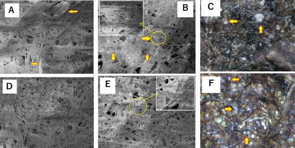 圖3:紙表面的顯微外觀(50倍放大),(A)在生物降解測試前帶有納米活性炭/纖維素紙;(BC)經(jīng)生物降解試驗后的納米活性炭/纖維素紙;(D)纖維素紙僅在生物降解試驗之前;(EF)纖維素紙僅經(jīng)過生物降解測試。黃色狹窄對應于來自土壤的真菌菌絲體,插入的圖像放大250倍。
