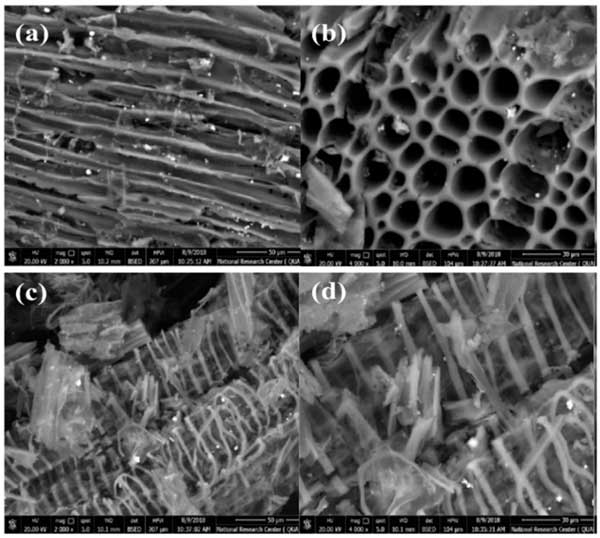 圖1:不同放大倍數(shù)(a和c-2000倍,b和d-4000倍)下活性炭(a,b)和改性活性炭(c,d)的掃描電子顯微鏡(SEM)。