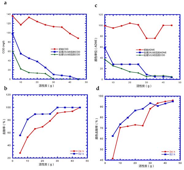 不同活性炭用量在24和54小時后COD和ADMI的變化如圖2所示。在初始COD濃度為88-136mg/L的情況下,分別通過吸附染料廢水24和52小時來完全去除COD需要45和30g的活性炭用量(圖2ab)。ADMI的降低和去除趨勢隨活性炭用量24和52小時的變化與COD變化相似(圖2)。ADMI隨著活性炭用量的增加而降低。活性炭吸附24小時和52小時后,殘留ADMI分別為4-5和5-7。隨著活性炭用量≥30g,ADMI的去除效率從88-96%提高到90-95%。