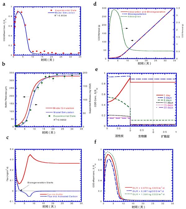 圖3:實驗結果和模型模擬(a)COD流出物,(b)生物質生長,(c)流入生物膜和活性炭的通量,(d)COD去除,(e)COD曲線,和(f)COD流出物各種有機負載率(OLR)。