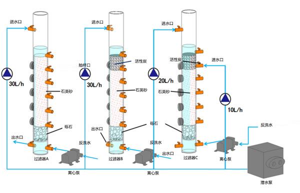 試驗(yàn)裝置如圖1所示,主體結(jié)構(gòu)采用有機(jī)玻璃制成,內(nèi)徑70mm,高度2000mm。過濾器包括進(jìn)水管、出水管、反沖洗水管、支撐層和過濾介質(zhì)層。200毫米高的支撐層由礫石制成。粒徑為0.5-1mm,和分別為1-2mm,過濾層的填料為石英砂和椰殼活性炭。過濾器A的填料層為1000mm石英砂。過濾器B、C的填料層均為上層200mm椰殼活性炭和下層800mm石英砂。根據(jù)水廠的設(shè)計(jì)規(guī)范,過濾器的過濾速度為8m/h,進(jìn)水流量為30L/h。過濾器A和B為單點(diǎn)進(jìn)水,過濾器C為兩點(diǎn)進(jìn)水,兩個進(jìn)水點(diǎn)分別位于過濾器頂部和20cm深度處;第一進(jìn)水點(diǎn)流量為20L/h,第二進(jìn)水點(diǎn)流量為10L/h。過濾器A和B是過濾器C的空白對照。過濾器每24小時反洗一次。