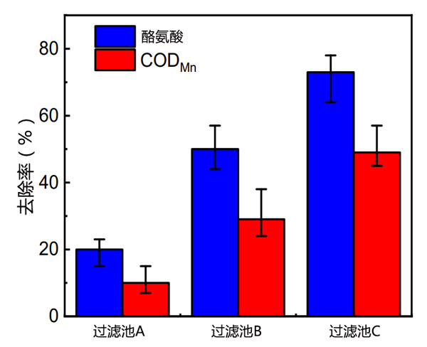 活性炭濾池出水二氯乙腈前體酪氨酸和CODMn的平均去除率如圖2所示。實(shí)驗(yàn)過程中,三個活性炭過濾器出水酪氨酸濃度依次下降:過濾器C(73%)>過濾器B(50%)>過濾器A(20%)(p<0.05)。生物濾池出水的酪氨酸濃度低于進(jìn)水。誰記錄了飲用水處理廠生物過濾后出水中DON濃度的增加,表明DON總體出水濃度的變化并不代表個體的變化,而是過濾器中不同個體的變化規(guī)律也不同。平均出水CODMn去除率的變化趨勢與平均出水酪氨酸去除率一致。CODMn去除率可以反映生物濾池中有機(jī)物的去除情況。酪氨酸是一種有機(jī)物,其分子結(jié)構(gòu)中含有還原性酚羥基和氨基,可被高錳酸鉀氧化。因此,CODMn去除率也可以作為酪氨酸去除的依據(jù)。