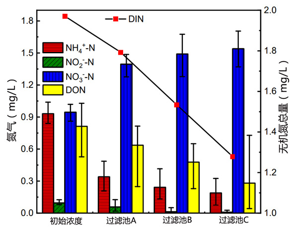 飲用原水中的氮主要以NH4+-N、NO2-N、NO3N和有機(jī)氮的形式存在。本實(shí)驗(yàn)中的大部分有機(jī)氮是酪氨酸。在生物濾池中,溶解無機(jī)氮(DIN)和DON是相互轉(zhuǎn)化的,因此有必要討論活性炭濾池中向氮的轉(zhuǎn)化。進(jìn)出活性炭濾池的水中氮的變化如圖3所示。溶解無機(jī)氮損失為活性炭濾池C>B>A(p<0.05),與CODMn的去除率一致。過濾器對有機(jī)物的利用隨著溶解無機(jī)氮損失的增加而增加,表明反應(yīng)中的溶解無機(jī)氮損失現(xiàn)象與過濾器反硝化有關(guān)。
