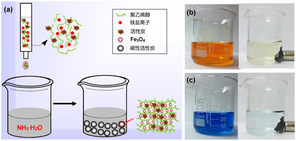 圖1:(a)磁性聚乙烯醇/活性炭復(fù)合凝膠制備示意圖。(b)亞甲基藍(lán)和(c)甲基橙的水溶液在(左)和(右)被活性炭磁性吸附劑吸附之前和之后(右)的照片。