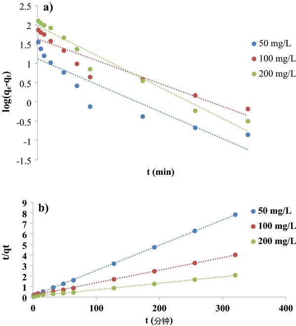 圖3:( a )活性炭吸附高錳酸鉀的一級動力學模型和( b ) 二級動力學模型。