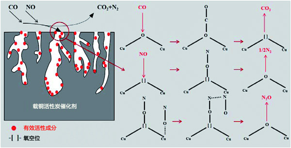 在活性炭催化劑表面通過選擇性催化還原技術(shù)(CO-SCR)反應(yīng)進(jìn)行的低溫脫硝是一種具有代表性的非均相催化體系,遵循Langmuir-Hinshelwood反應(yīng)機(jī)理。因此,提出了圖3所示的脫硝機(jī)制,用于在活性炭催化劑上對NO進(jìn)行CO還原;钚越M分Cu均勻分散在活性炭上,增加了催化劑的比表面積和對NO和CO的吸附。這一結(jié)論表明Cu均勻分布在活性炭催化劑的表面,將脫硝效率提高到80%。CO吸附在催化劑表面以還原-O-Cu2+到=Cu+并生成CO2。吸附的NO解離成N和O,解離的N原子與NO分子結(jié)合形成N2O。據(jù)報(bào)道,NO的解離是CO誘導(dǎo)的NO消除的關(guān)鍵步驟。活性位點(diǎn)的釋放促進(jìn)了CO的吸附,最后N2O和=Cu+反應(yīng)生成N2和–O–Cu2+,這進(jìn)一步促進(jìn)了脫硝反應(yīng)。在CO與NO的反應(yīng)中,Cu2+↔Cu+交換可能會改變催化劑表面的價(jià)態(tài),更多的氧空位可用于轉(zhuǎn)化過程,促進(jìn)NO向N2的轉(zhuǎn)化。
