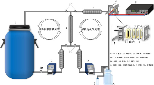 制備含有300mg/L-1苯的甲醇溶液和含有50mmol/L-1電解質(zhì)(H2SO4)的水介質(zhì),以確定污染物的去除效率。初始pH值約為1.5,在電化學(xué)過(guò)程測(cè)試期間未觀(guān)察到顯著變化。使用包含電極作為陽(yáng)極和鈦板作為陰極的單隔室壓濾流動(dòng)池(在圖1中詳細(xì)表示)進(jìn)行電解,其具有13.5cm2的明顯幾何面積。兩個(gè)電極由墊片隔開(kāi),距離為4毫米。使用含有1L溶液的夾套玻璃容器,蠕動(dòng)泵以1L/min-1的速度將溶液泵入熱交換器,然后循環(huán)通過(guò)電池。使用恒溫浴將溫度控制在25℃。在恒電流模式下以50mA/cm-2的電流密度進(jìn)行電解。使用前,將陽(yáng)極在H 2 SO4/0.05mol/L-1溶液中以40mA/cm-2極化20分鐘, 以從其表面去除任何雜質(zhì)。電化學(xué)實(shí)驗(yàn)一式三份進(jìn)行。