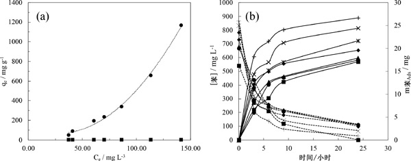 圖3:苯在水和甲醇中的吸附等溫線(xiàn)(a)和苯(b)在0.030L甲醇中不同量的活性炭中的吸附等溫線(xiàn)。左軸甲醇上的苯濃度和右軸活性炭中剩余的苯質(zhì)量。