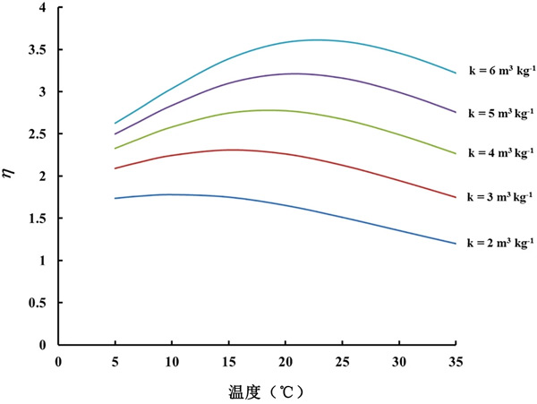 查看活性炭的檢測器的結(jié)果(圖2)可以看出,相同溫度下的CF0在活性炭之間存在差異。這意味著不同活性炭的吸附能力存在一些差異。在所有模塊設(shè)計中,假設(shè)21℃下的吸附容量值為4m3/kg-1。然而,由于我們的實驗結(jié)果表明不同活性炭材料的k可能存在差異。不同k值的結(jié)果如圖3所示?梢钥闯,對于區(qū)間2-6m3/kg-1內(nèi)的所有k值,η的變化(例如最大/最小比率)與溫度的變化遠小于未包裝傳感器觀察到的230-305%的變化。