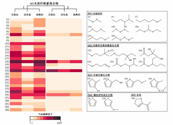 圖2:(a)在未處理和處理過的兩種木質素混合物中檢測到的含硫氣味劑氣味稀釋因子的彩色差異和(b1-b5)硫氣味劑的結構式根據(jù)其化學結構分為亞組數(shù)字(2-44)是指氣味的連續(xù)順序。