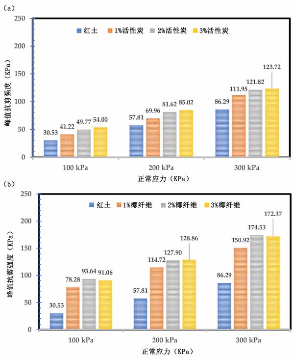活性炭試樣的剪切強度與剪切應變的關系。峰值剪切強度隨著正應力的增加而提高,特別是300kPa正應力。此外,添加活性炭增加了峰值剪切強度,并且增強率隨著法向應力的增加而增加,如圖4a所示。同樣,添加0.5%的椰殼纖維進一步提高了活性炭穩(wěn)定土的峰值剪切強度,如圖4b所示。雖然在天然紅土中添加活性炭會增加峰值強度,但對于超過2%的活性炭,增加率并不顯著。例如,活性炭穩(wěn)定土的峰值強度分別為2%和3%活性炭的121.8kPa和123.72kPa。總體而言,與本研究的結果相似。發(fā)現(xiàn)在石灰穩(wěn)定土壤中使用椰殼纖維可進一步提高抗拉強度和抗壓強度。還觀察到,椰殼纖維的加入提高了膨脹土中的兩個剪切參數(shù)。