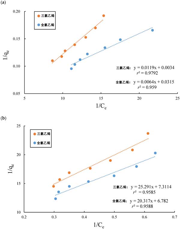 圖2:(a)活性炭和(b)硅膠吸附氯代有機(jī)化合物的實(shí)驗(yàn)數(shù)據(jù),符合Langmuir等溫線的線性形式。