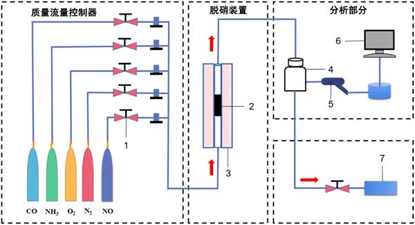 圖2:氣體反應(yīng)裝置示意圖(1)轉(zhuǎn)子流量計,(2)催化劑,(3)固定床反應(yīng)器,(4)緩沖氣瓶,(5)探測槍,(6)煙氣分析儀,(7)廢氣回收裝置。