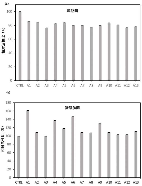 圖2:(a)固定在A1至A13的活性炭樣品上后,脂肪酶的相對(duì)活性。數(shù)據(jù)以95%的置信區(qū)間(誤差線)呈現(xiàn)。(b)固定在活性炭樣品上后豬脂肪酶的相對(duì)活性從A1到A13。