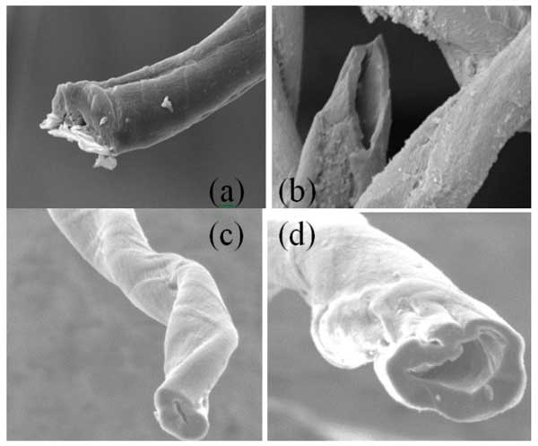 通過煅燒和HNO3、H2O2和KOH活化,廢棉纖維成功轉(zhuǎn)化為不同結(jié)構(gòu)的活性炭。圖1顯示了三種活性炭的SEM圖像。可以看出,化學(xué)活化有助于大孔隙的形成。在整個(gè)纖維長度上可以觀察到一個(gè)空心芯,直徑約為0.5–5.0µM,形狀幾乎為圓形;钚蕴烤哂懈叨榷嗫椎慕Y(jié)構(gòu),核心直徑在大約0.5和5μM之間(圖1b,d)。這種大孔隙率可能與纖維內(nèi)壁木質(zhì)素的化學(xué)破壞有關(guān)。參考活性炭(圖1a)呈現(xiàn)大孔隙,而形態(tài)特征是纖維中芯的出現(xiàn),其直徑取決于活化劑。使用過氧化氫作為活化試劑獲得最大直徑(圖1b)。如圖1b-d所示,前體的結(jié)構(gòu)(最初具有干凈的表面)在每次化學(xué)處理后都會(huì)被破壞。有趣的是,其中一種活性炭的表面在化學(xué)活化的影響下發(fā)生明顯變化(與其他活性炭相比)。