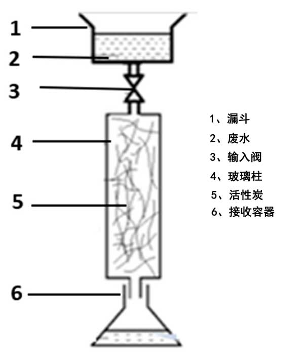 通過在密封玻璃瓶中將已知量(4.0g)的活性炭與50mL實(shí)際廢水樣品進(jìn)行反應(yīng),進(jìn)行批量吸附平衡實(shí)驗(yàn)。測試了具有不同初始硫濃度(100、300、500、800和1000mg·L-1)的五個(gè)樣品。將瓶子在恒溫?fù)u床上放置24小時(shí),直至達(dá)到平衡(最終pH值:10.5)。用于床吸附實(shí)驗(yàn)的裝置的示意圖如圖2所示。將碳化纖維填充到玻璃柱中以研究它們的吸附能力。廢水被引入漏斗并通過輸入閥以將流量調(diào)節(jié)為4–5.10m3·h-1。首先,使用流經(jīng)柱的蒸餾水潤濕床吸附裝置以改善活性炭纖維的潤濕特性。其次,允許漏斗中的煉油廠廢水樣品內(nèi)容物通過活性炭床通過重力排放到接收容器。每小時(shí)回收處理過的水。
