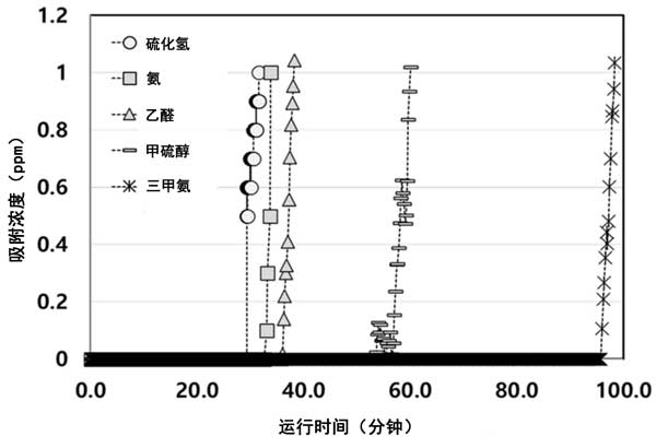 為了評(píng)估活性炭對(duì)不同廢氣的有效吸附量,應(yīng)研究其吸附能力。廢氣的氣味閾值和刺激水平在十億分之一的水平。吸附劑的總吸附容量很難用作從廢物中去除廢氣的設(shè)備的設(shè)計(jì)因素。因此,我們根據(jù)突破點(diǎn)計(jì)算了小于1ppm的有效吸附量。突破柱實(shí)驗(yàn)在304不銹鋼管式反應(yīng)器中進(jìn)行,總流量為1L/min,其中包含硫化氫(H2S)、氨(NH3)、乙醛(AA)、甲硫醇(MM)和三甲胺(TMA),如圖2所示。突破曲線(xiàn)依次為H2S、NH3、AA、MM、TMA。與廢氣相比,TMA具有更好的動(dòng)態(tài)吸附性能,因?yàn)樗哂懈L(zhǎng)的突破時(shí)間和相應(yīng)的更大的有效吸附容量(<1ppm)。