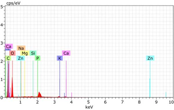 揮發(fā)物含量直接在自動近似分析儀中測量。當爐油樣品燃燒完全時,不可燃殘留物通過灰分含量反映出來。在此過程中使用可承受300至400℃溫度的高溫馬弗爐。在空氣中存在氧氣的情況下,某些物質(zhì)(如水和其他揮發(fā)性元素)會燃燒,而其他物質(zhì)(包括有機分子)會蒸發(fā)。通過比較灰化前后樣品的重量可以計算出樣品中的灰分含量。固定碳的計算方法是從100中減去揮發(fā)性物質(zhì)的百分比、水分含量和灰分含量。活性炭的堆積密度是借助密度計。用能量色散X射線分析法分析活性炭的化學成分圖2;钚蕴康腅DAX分析具有由C、O、Zn等組成的元素。