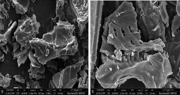 使用掃描電子顯微鏡分析獲得的活性炭的孔結(jié)構(gòu)。SEM設(shè)備具有超高分辨率低電壓成像和獨特的低真空能力。SEM圖像是在15kV時以1nm、1kV時1.4nm、3kV時1.8nm和30Pa的不同分辨率拍攝的。觀察活性炭的表面物理形態(tài)是通過使用SEM完成的技術(shù)。圖3顯示活性炭的SEM圖像。這表明活性炭的外表面具有均勻開放的大孔。此外,活性炭的表面是高度多孔的,其特點是不均勻。同樣清楚的是,活性炭在其外表面具有微孔和空腔,暗區(qū)位于該處。經(jīng)受碳化后,活性炭由于ZnCl2的蒸發(fā)而產(chǎn)生空隙(稱為氣孔)?梢詫⑦@些孔視為通向微孔網(wǎng)絡(luò)的通道。