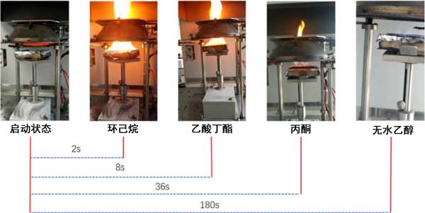 圖3顯示了四個樣品的初始燃燒火焰和點火時間。可以看出,四個樣本的點火時間按照環(huán)己烷<乙酸丁酯<丙酮<純無水乙醇的順序遞增。顯然,吸附VOCs后的樣品更易燃燒,其中環(huán)己烷樣品是最容易被點燃的一種。從火焰尺度來看,吸附樣品的火焰高度較大,燃燒強度較強。此外,純無水乙醇樣品的火焰顏色為淺藍色,表明純無水乙醇燃燒時樣品的表面溫度低于其他三個吸附樣品。