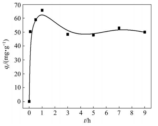用100mL硫代硫酸銅溶液進(jìn)行銅吸附動力學(xué)試驗(yàn),初始銅濃度為3g/L。硫代硫酸鹽與銅的摩爾比為8:1。除另有說明外,0.5g活性炭用于吸附試驗(yàn)。圖2顯示了Cu(S2O3)23−在活性炭上的吸附動力學(xué)。活性炭對銅的吸附容量在前1h急劇增加,隨后略有下降并趨于穩(wěn)定。