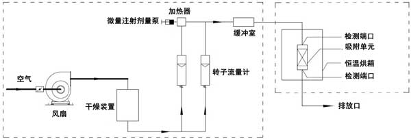 動態(tài)吸附實驗在室溫(25℃)下進(jìn)行。實驗裝置由氣體分配系統(tǒng)和吸附系統(tǒng)兩部分組成。吸附系統(tǒng)由恒溫箱和吸附單元組成。檢測口位于吸附系統(tǒng)之前和之后。動態(tài)法測定活性炭對脈沖負(fù)荷緩沖性能的裝置如圖1所示。本實驗以乙醇或二甲苯為單一檢測對象。氣體分配系統(tǒng)包括風(fēng)扇、干燥裝置、轉(zhuǎn)子流量計、微注射計量泵、加熱器和緩沖室。使用FT-IR傅里葉氣體分析儀作為測量設(shè)備。在氣體分配系統(tǒng)中,在短時間內(nèi)(2分鐘和5分鐘),微注射計量泵的注射量迅速增加到原始體積的預(yù)定倍數(shù)(10倍和20倍),以產(chǎn)生脈沖負(fù)載。在吸附系統(tǒng)中,吸附單元內(nèi)放置活性炭。吸附單元的直徑為31mm。活性炭的填充高度分別為2cm、4cm、6cm、8cm。將吸附裝置置于恒溫箱內(nèi)。吸附劑和吸附物的入口空氣保持在室溫。進(jìn)行了吸附劑在室溫下吸附吸附質(zhì)的脈沖加載實驗。潔凈空氣通過干燥裝置后,利用轉(zhuǎn)子流量計將其按特定比例分成兩個通道。通過微注射泵將特定濃度的乙醇或二甲苯氣體注射到氣體中。另一種氣體用作稀釋氣體。兩種氣體流入緩沖室,完全混合后進(jìn)入恒溫箱。穩(wěn)定的氣體按照實驗設(shè)定的濃度、流量和溫度進(jìn)入吸附單元。在通過吸附單元之前和之后測量乙醇或二甲苯的濃度。