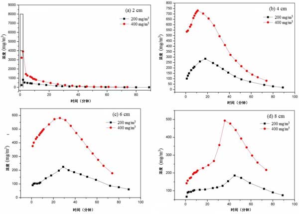 選擇平衡吸附濃度為200和400mg/m3的活性炭。截面風(fēng)速設(shè)定為0.3m/s。乙醇的脈沖濃度是原始平衡濃度的20倍。脈沖時間為2分鐘。不同活性炭床層高度、不同平衡吸附濃度下脈沖后出口濃度變化曲線如圖3所示。