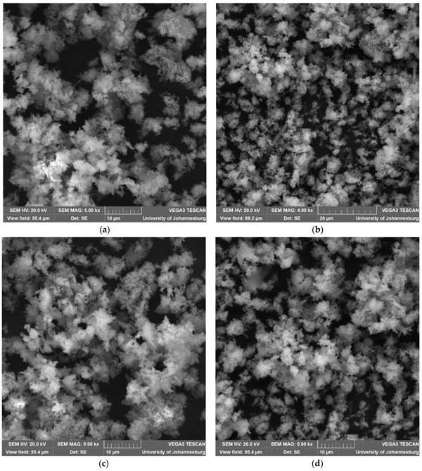 活性炭由各種富含碳的材料制成,例如煤、椰殼或木材,通過(guò)活化過(guò)程可提高其孔隙率和表面積。這種高表面積加上孔隙網(wǎng)絡(luò)使活性炭能夠吸附各種物質(zhì)。其吸附能力源于物理吸附(污染物受范德華力控制)和化學(xué)吸附(碳表面和污染物分子之間發(fā)生相互作用)。圖1a–d中的SEM 圖像用于說(shuō)明吸附劑的表面形貌。這些SEM圖像顯示活性炭的形貌為無(wú)定形。