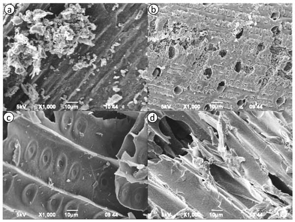 圖1a-d顯示了來自不同植物來源的活性炭樣品的形貌SEM圖像。圖像突出顯示了樣品表面結(jié)構(gòu)和孔隙率的明顯差異。圖1a顯示了粗糙的表面,表面具有高密度的不規(guī)則、未受干擾的顆粒。大量裂紋和裂縫的存在表明多孔結(jié)構(gòu)發(fā)達。圖1b顯示出類似的多孔形貌,具有廣泛的薄膜狀結(jié)構(gòu)和大空隙,表明活化和孔隙形成效率高。
