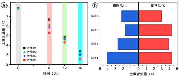 通過吸附實驗研究了活性炭樣品在污染土壤修復(fù)中的潛在用途。對活性炭對汽油、煤油和柴油的吸附能力進行了評估。在所有樣品中,活性炭1的吸附能力最高:汽油為9.3g/g,煤油為9.0g/g,柴油為10.1g/g。這些優(yōu)異的結(jié)果歸功于活性炭發(fā)達的微孔和中孔結(jié)構(gòu),氮吸附/解吸等溫線就是明證。相比之下,活性炭2的吸附能力中等,石油產(chǎn)品平均為7.0g/g,而其他的吸附能力較低,范圍為4.5至5.1g/g。所有樣品中柴油的吸附量均高于汽油和煤油,這可能是由于柴油的粘度較高,從而增強了其與碳表面的相互作用。為了在實際條件下驗證結(jié)果,將活性炭引入受油污染的土壤中,并在處理后8至16天內(nèi)定期采集樣品,以使用重量法估算油含量。圖2a顯示了土壤樣品中的初始和后續(xù)油含量。